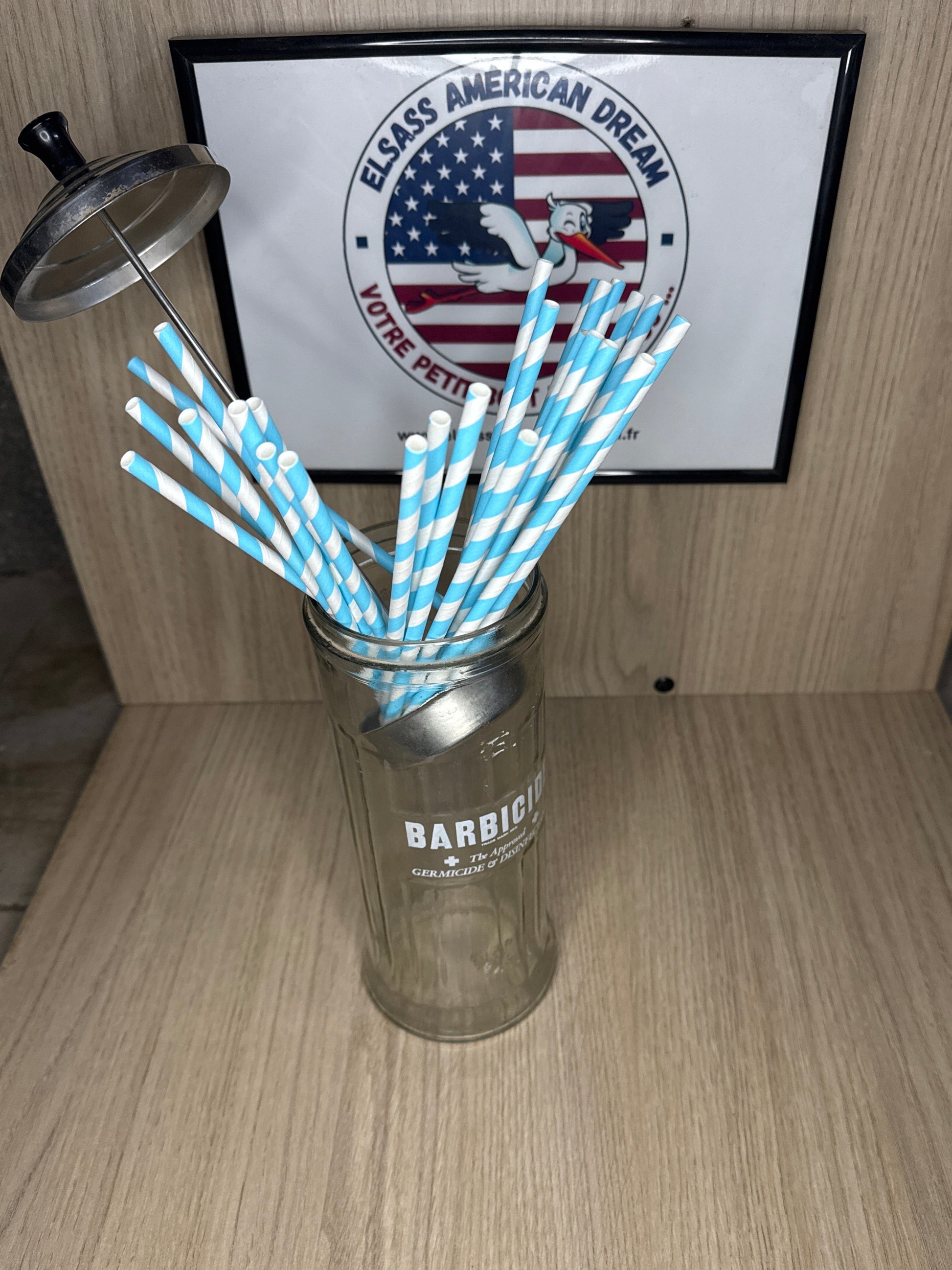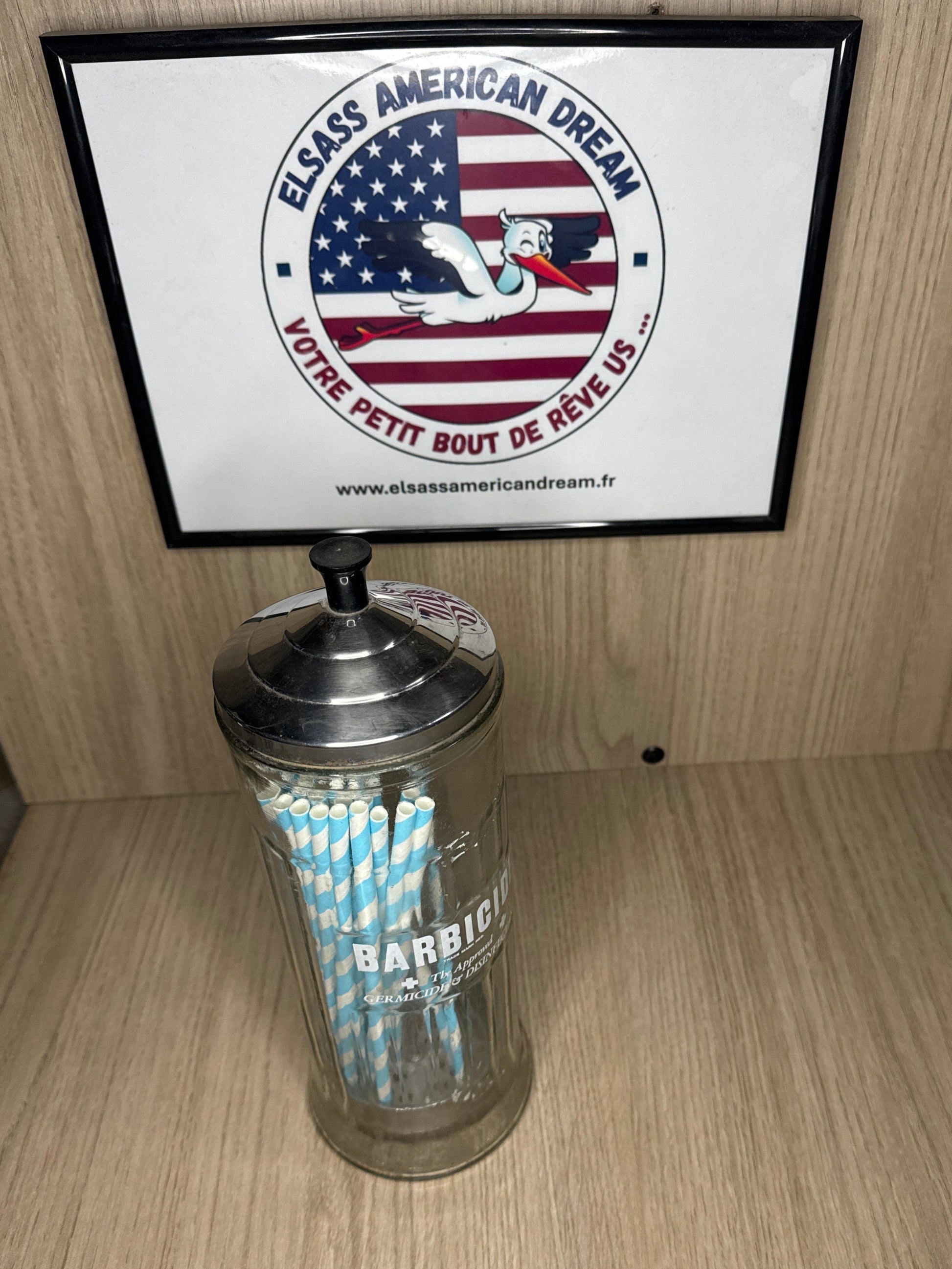 Voici un objet unique et plein de caractère : un authentique flacon de Barbicide reconverti en distributeur à pailles ! Détourné de son usage d'origine, ce bocal emblématique des salons de coiffure américains devient un accessoire déco pratique, rétro et totalement dans l’air du temps.